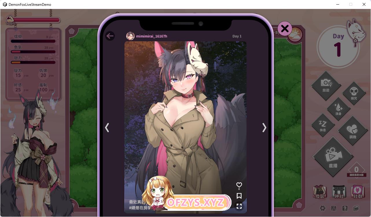 玩家将扮演被驱魔师工作所耽误的超级经纪人,帮助败给自己的二尾妖狐十七夜月 未来,恢复她原有的实力,再堂堂正正的一决胜负。 脑洞大开的你帮助妖狐恢复妖力的方式,就是进行时下最流行的「色情直播」! 游戏中将有多达11种直播主题供玩家选择,包含「女仆、泳装、SM、兔女郎、肛交、不兽控制、双飞」等应有尽有!
