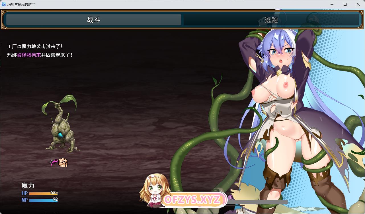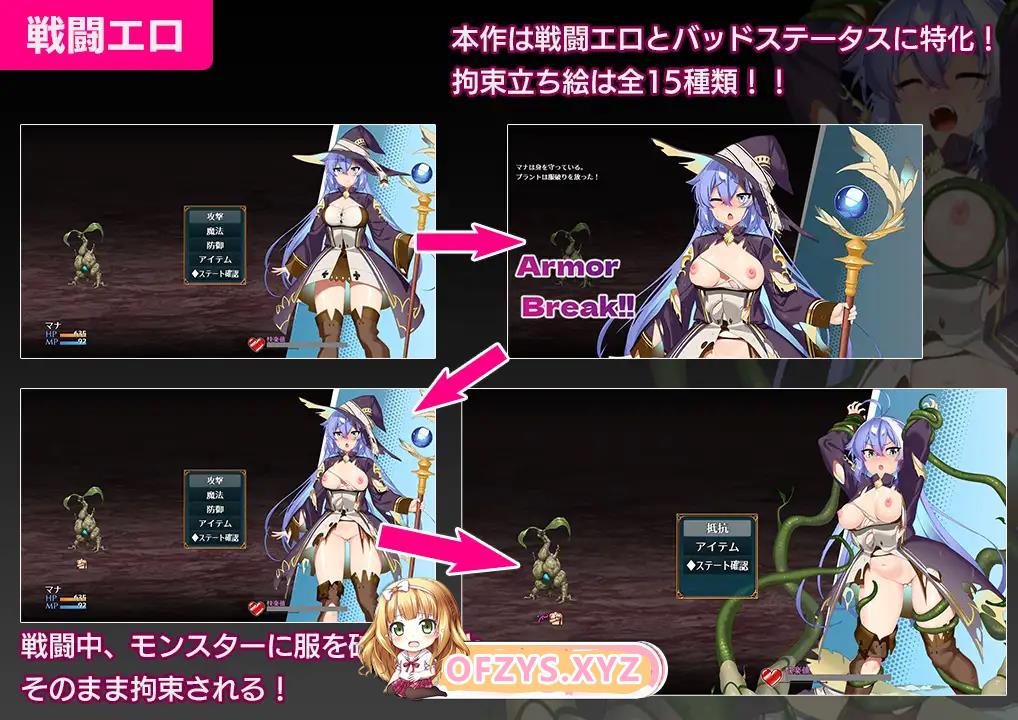 战斗中,潜藏于地下城的危险魔物会撕裂玛娜的衣物并将其束缚。